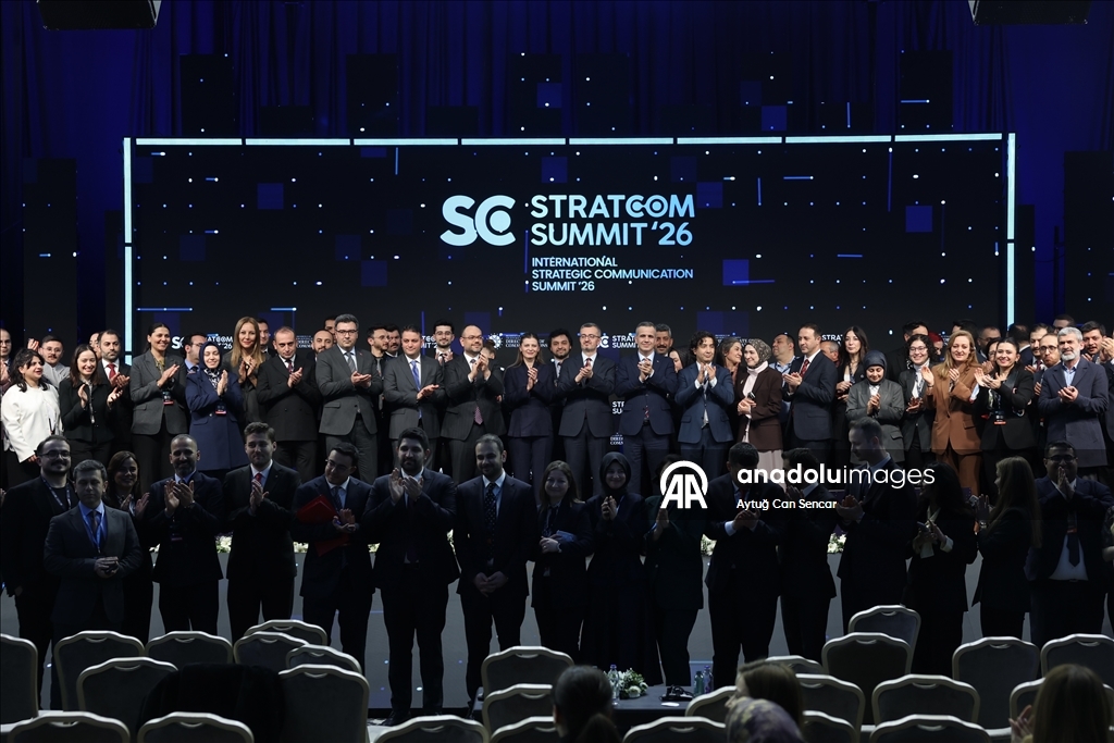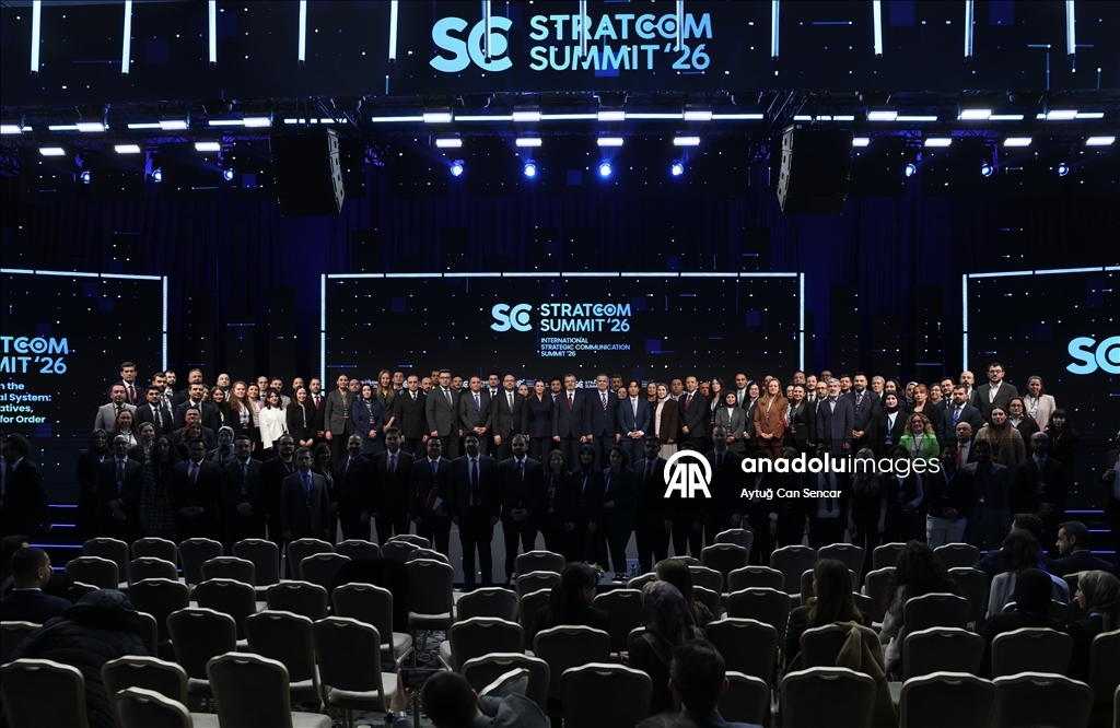 ISTANBUL, TURSKA - 28. MART: Direktor komunikacija Turske Burhanettin Duran pozira za porodičnu fotografiju s učesnicima nakon završne sesije pod nazivom "Perspektive usmjerene ka budućnosti: Red u novom međunarodnom sistemu" na STRATCOM samitu 2026. koji je organizirala Direkcija za komunikacije Predsjedništva Turske u Istanbulu, Turska, 28. marta 2026.