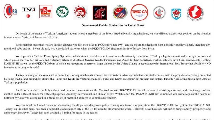 The statement was signed by some 11 Turkish university organizations, including the Turkish Student Association (TSA), the Turkish Student Organization (TSO), the Turkish American Student Association - University of Delaware (TASA) and some independent students from 20 American universities including Boston University, Harvard University and the Massachusetts Institute of Technology and Oregon State University.