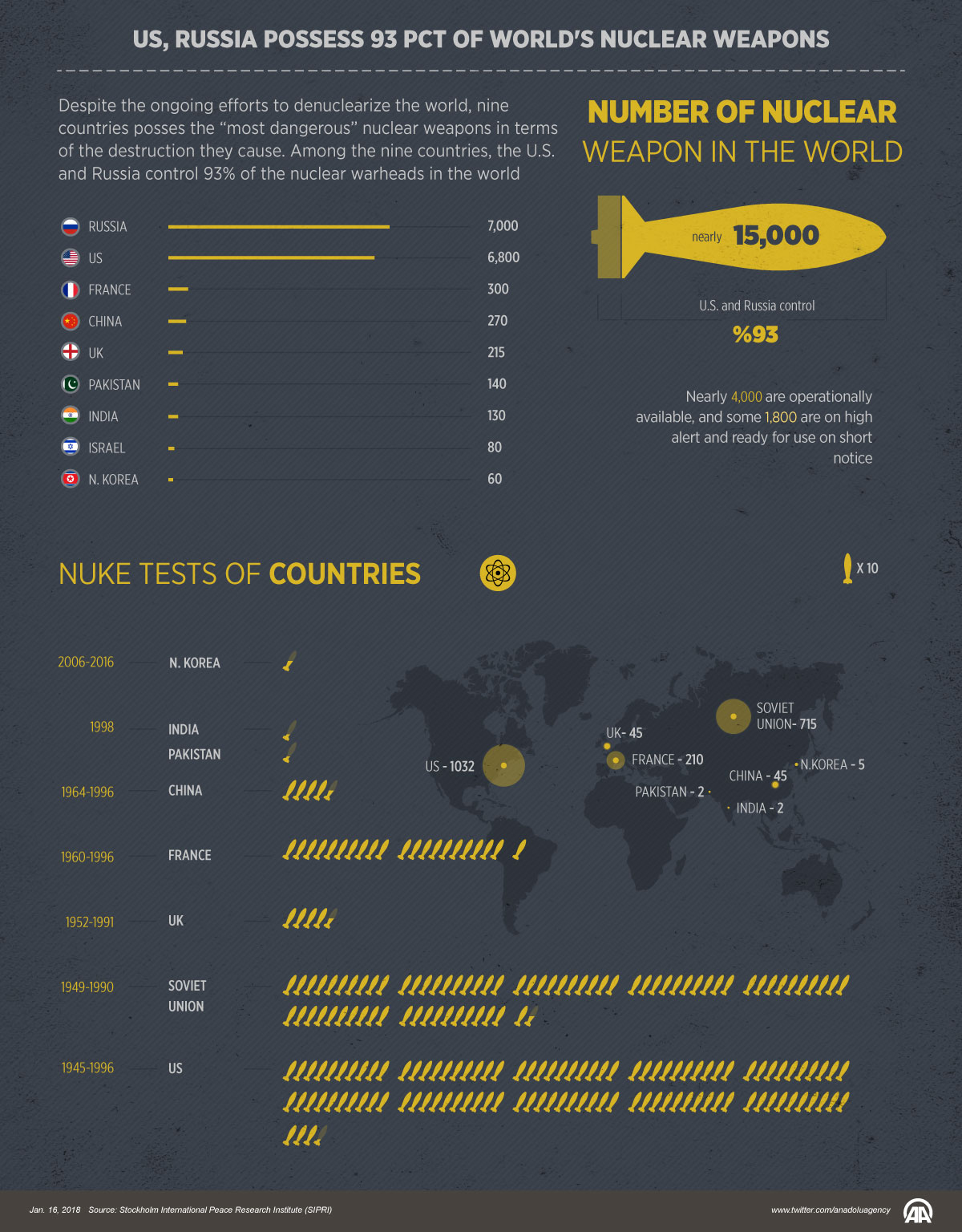 Among the nine countries, the U.S. and Russia control 93 percent of the nuclear warheads in the world.16 January 2018•Update: 16 January 2018