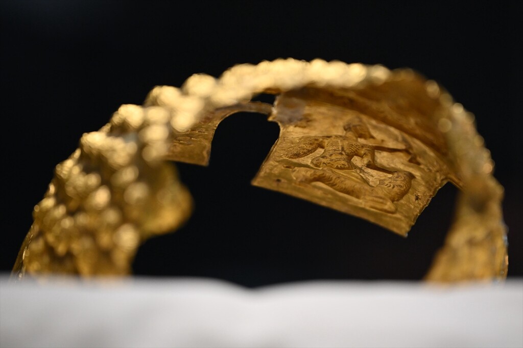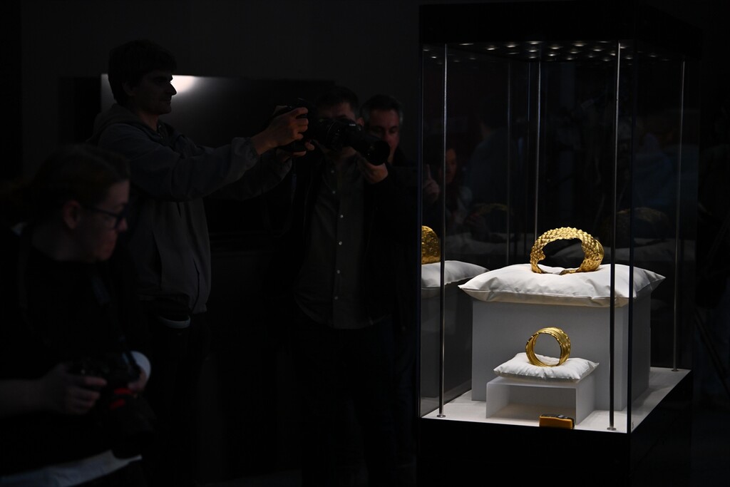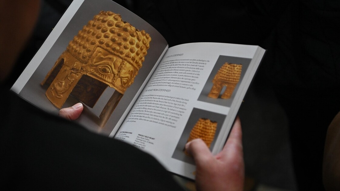 A ceremonial gold helmet and two gold bracelets are displayed during a media presentation at the National History Museum of Romania in Bucharest, Romania, 21 April 2026.