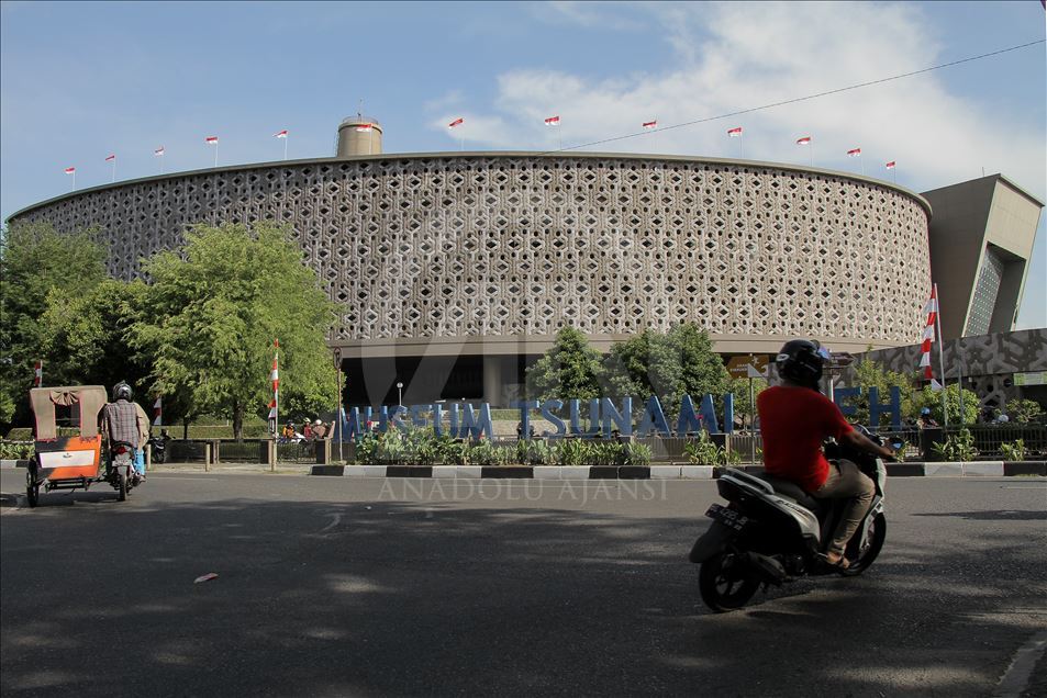 Seorang pengendara melintas di depan Museum Tsunami Aceh yang terletak di Banda Aceh, Indonesia, pada 19 Agustus 2019. Museum ini dibangun pada 2007 bertujuan untuk mengedukasi masyarakat tentang gempa dan tsunami Aceh 2004 silam, serta menjadi tempat mitigasi bencana alam. Khalis Surry