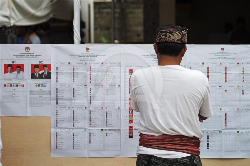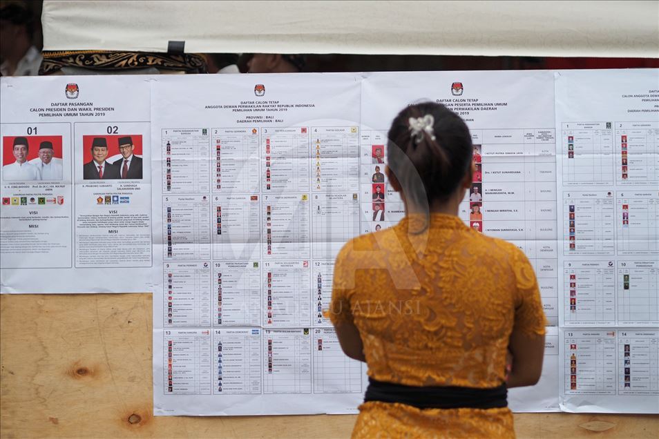 Seorang warga melihat papan informasi di Tempat Pemungutan Suara (TPS) 25 desa Tuban, Kecamatan Kuta Badung, Bali, Indonesia pada 17 April 2019. Hari ini Rakyat Indonesia melaksanakan pemilihan umum secara serentak untuk memilih presiden dan wakil presiden serta anggota Dewan Perwakilan Rakyat (DPR), Dewan Perwakilan Daerah dan dewan provinsi dan kota (DPRD). Mahendra Moonstar