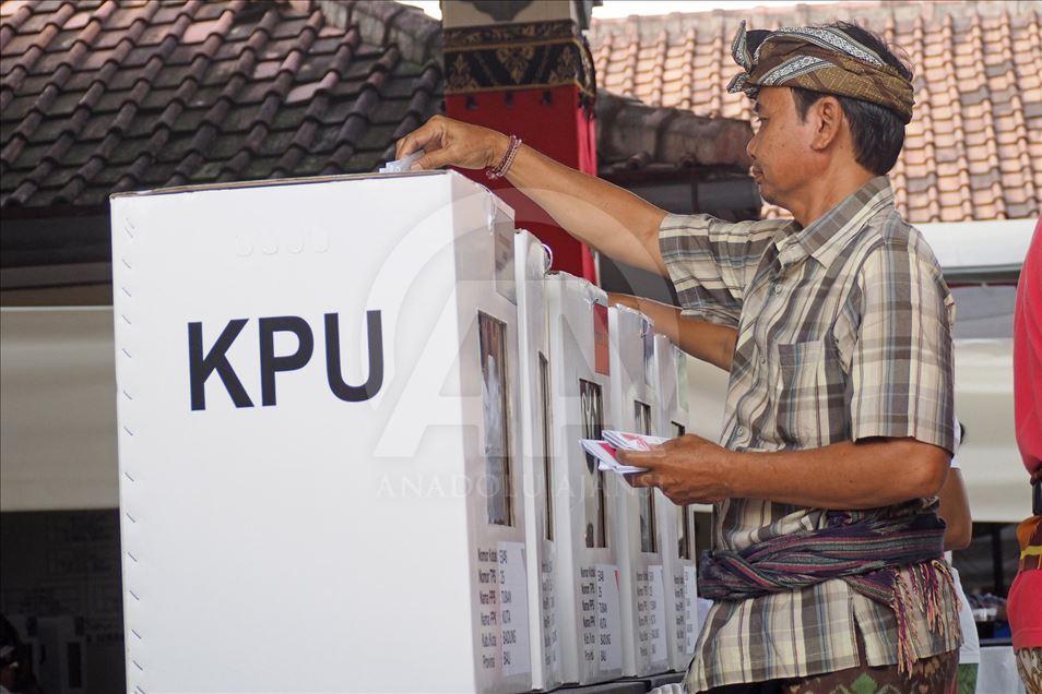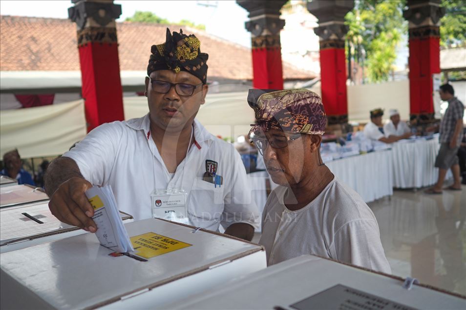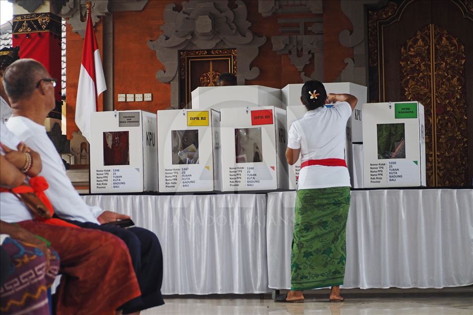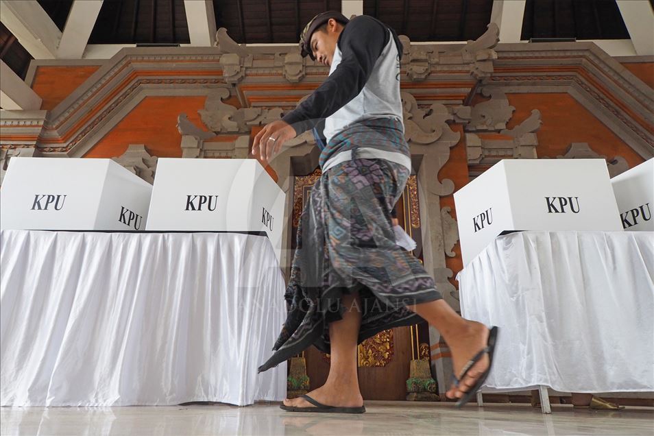 Seorang warga memasukkan surat suara kedalam kotak suara di Tempat Pemungutan Suara (TPS) 25 desa Tuban, Kecamatan Kuta Badung, Bali, Indonesia pada 17 April 2019. Hari ini Rakyat Indonesia melaksanakan pemilihan umum secara serentak untuk memilih presiden dan wakil presiden serta anggota Dewan Perwakilan Rakyat (DPR), Dewan Perwakilan Daerah dan dewan provinsi dan kota (DPRD). Mahendra Moonstar