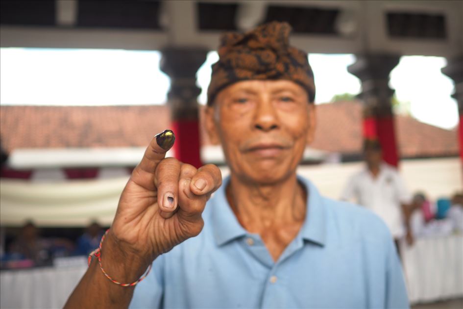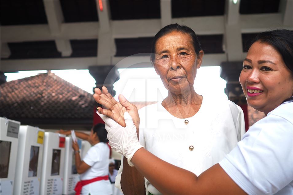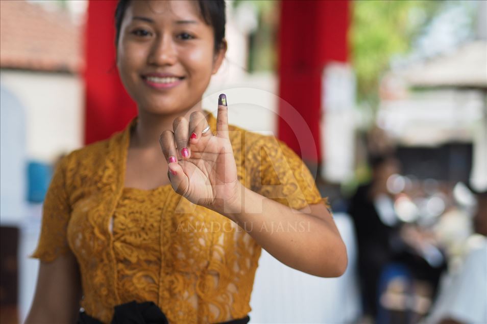 Seorang warga menunjukan jari berisi tinta sebagai tanda setelah memberikan di Tempat Pemungutan Suara (TPS) 25 desa Tuban, Kecamatan Kuta Badung, Bali, Indonesia pada 17 April 2019. Hari ini Rakyat Indonesia melaksanakan pemilihan umum secara serentak untuk memilih presiden dan wakil presiden serta anggota Dewan Perwakilan Rakyat (DPR), Dewan Perwakilan Daerah dan dewan provinsi dan kota (DPRD). Mahendra Moonstar