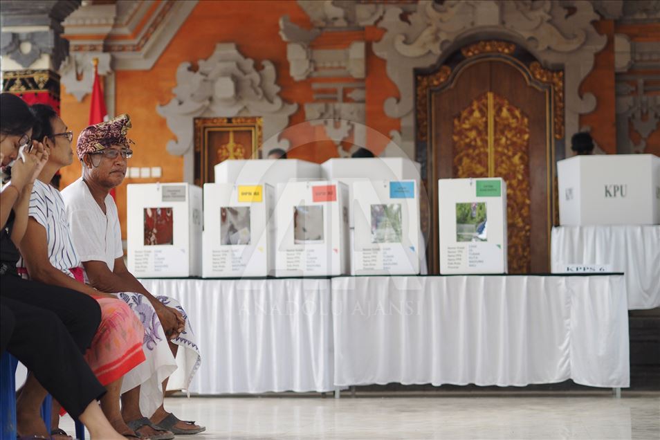 Warga mengantre untuk melakukan pencoblosan di Tempat Pemungutan Suara (TPS) 25 desa Tuban, Kecamatan Kuta Badung, Bali, Indonesia pada 17 April 2019. Hari ini Rakyat Indonesia melaksanakan pemilihan umum secara serentak untuk memilih presiden dan wakil presiden serta anggota Dewan Perwakilan Rakyat (DPR), Dewan Perwakilan Daerah dan dewan provinsi dan kota (DPRD).
