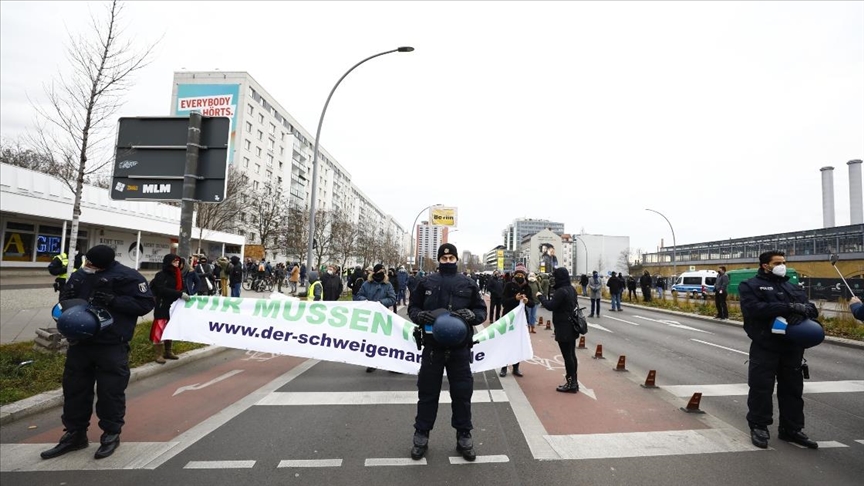 Başkent Berlin’de “Ayrımcılığa karşı ve insan hakları için sessiz yürüyüş” sloganıyla düzenlenen gösteri çerçevesinde binin üzerinde kişi Kovid-19 tedbirlerini protesto etmek amacıyla Holzmarkt Caddesi üzerinde toplandı.