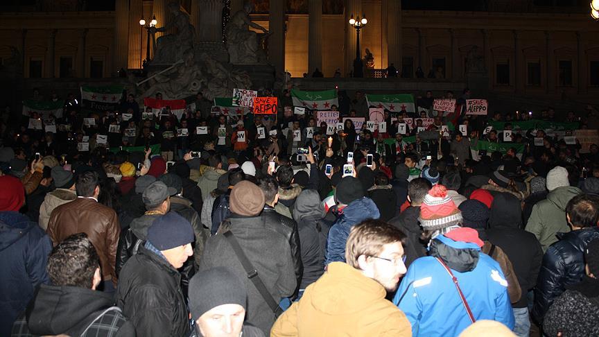 Avusturya'nın başkenti Viyana'da Meclis binası önünde toplanan göstericiler, Halep'te sivillere yönelik saldırıları protesto etti.