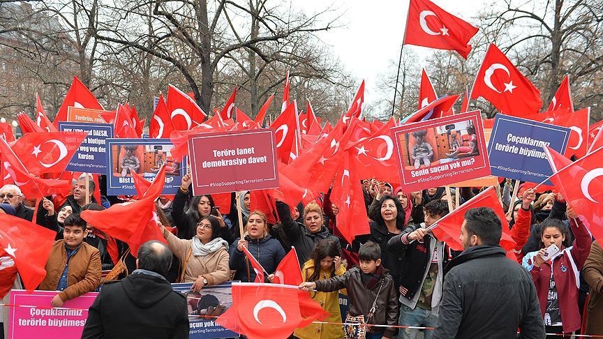 İstiklal Marşı ve Fransa ulusal marşının okunmasıyla başlayan gösteride, meydana asılan dev Türk bayrağı altında toplananlar, “Teröre hayır”, “Şehitler ölmez, vatan bölünmez”, “Avrupa teröre destek verme”, “Her Türk asker doğar”, “Kalbimiz Türkiye ile” şeklinde Türkçe ve Fransızca dövizler taşıyarak sloganlar attı.