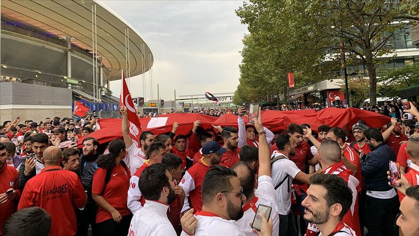 Karşılaşmanın oynanacağı Stade de France'a akın eden Türk taraftarları, dev Türk bayrakları eşliğinde coşkulu şekilde milli takımı tezahüratlarla destekledi.