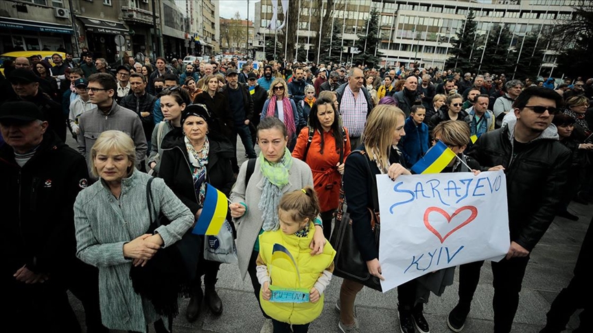 Saraybosna Devlet Tiyatrosu önünde toplanan göstericiler, "Ukrayna halkının yanındayız" mesajları verdi.