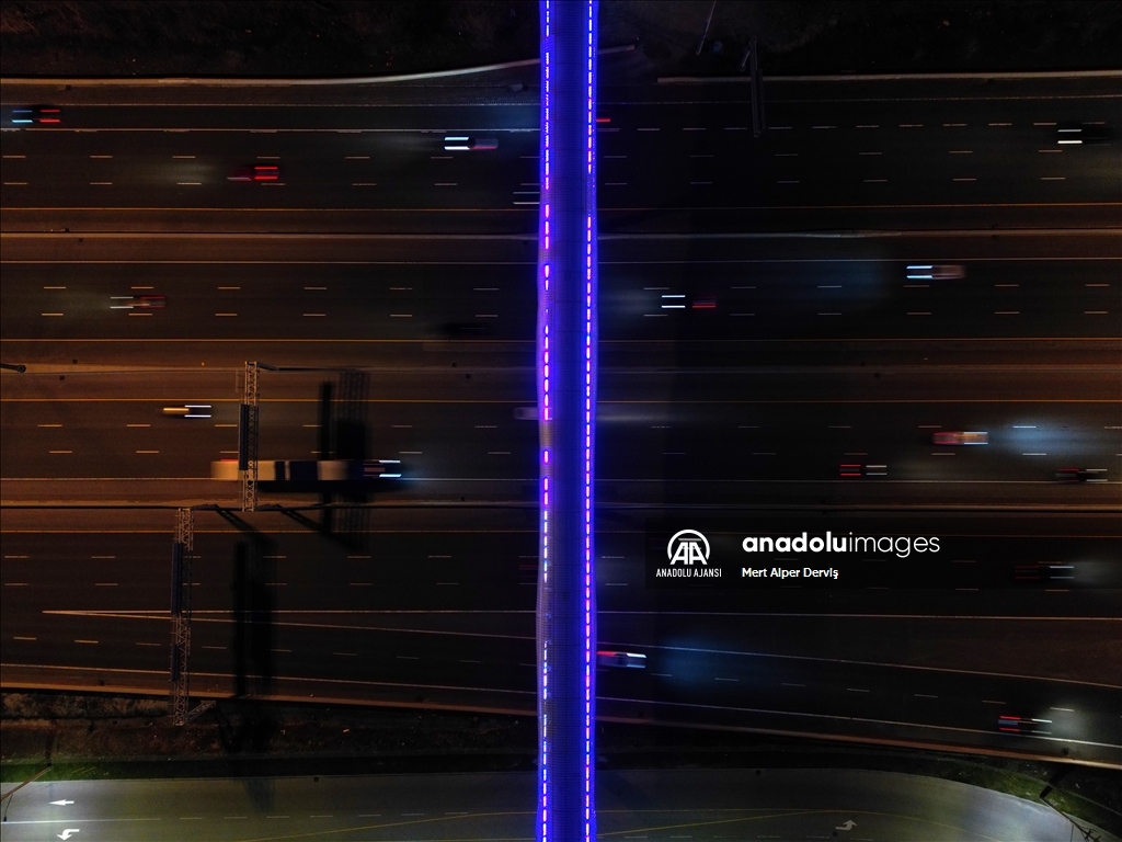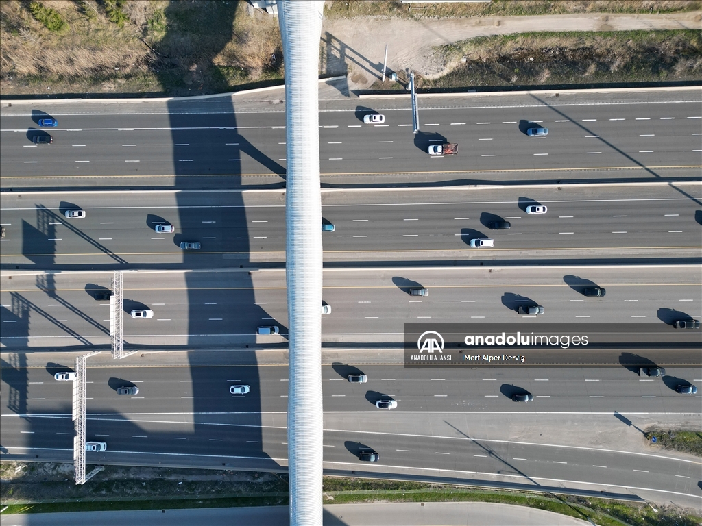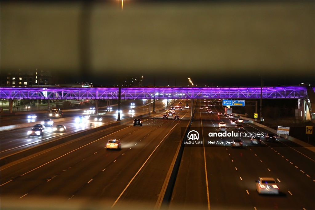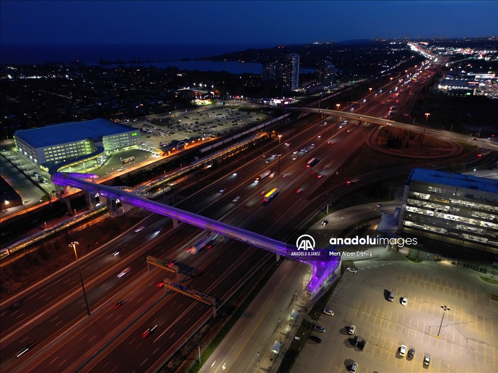 Kanada'nın Ontario eyaletinin Pickering şehrindeki Guinness Dünya Rekoru sahibi Pickering Yaya Köprüsü havadan görüntülendi. Toronto'nun 45 dakika doğusunda, 14 şeridi, altı aktif demiryolu hattı ve iki şeritli yerel yolu olan 401 numaralı otoban üzerinde yer alan 250 metrelik köprünün gece aydınlatması için de 300 LED ışık kullanılıyor. ( Mert Alper Derviş - Anadolu Ajansı )Mert Alper Derviş