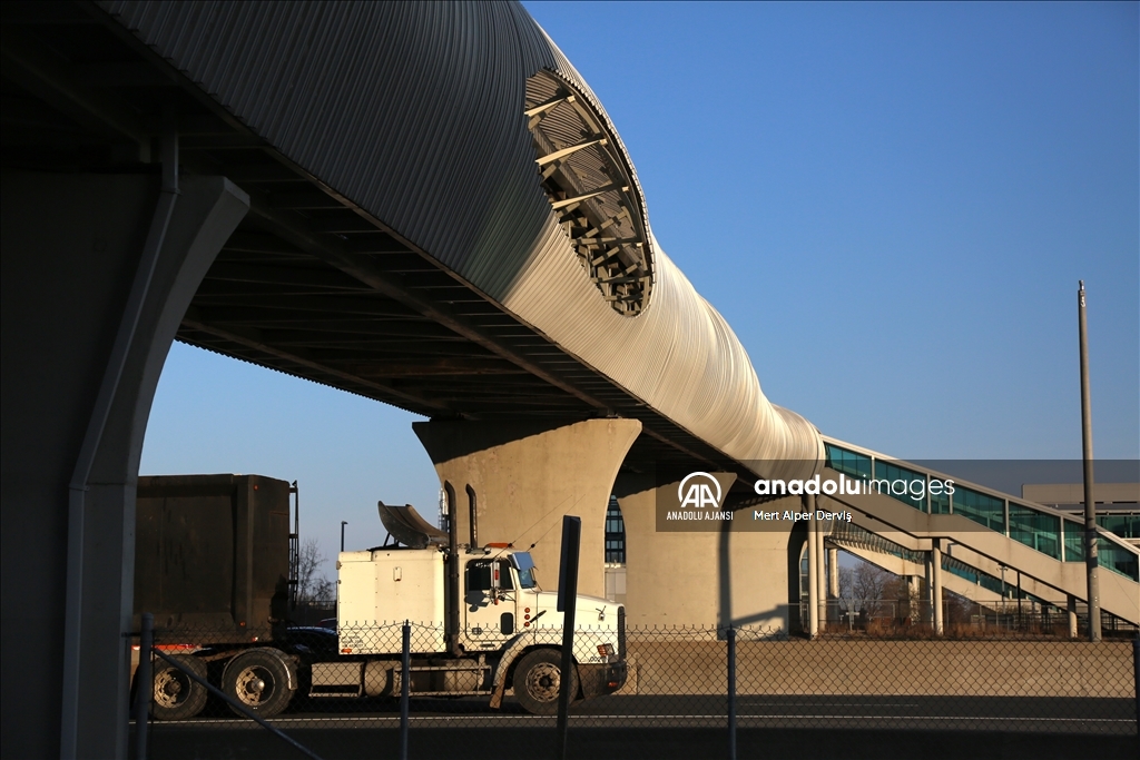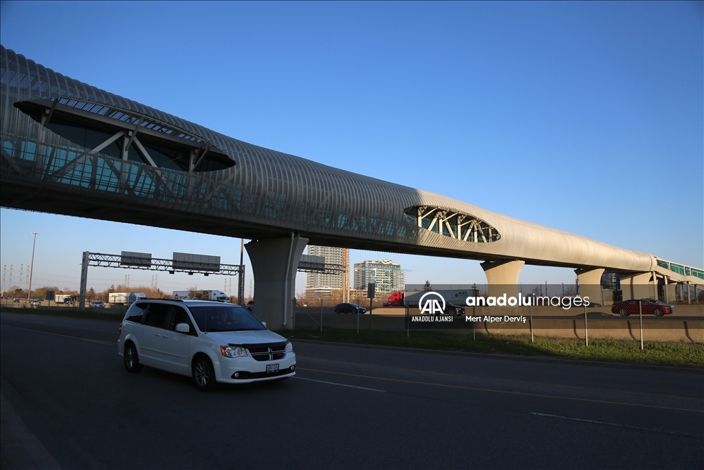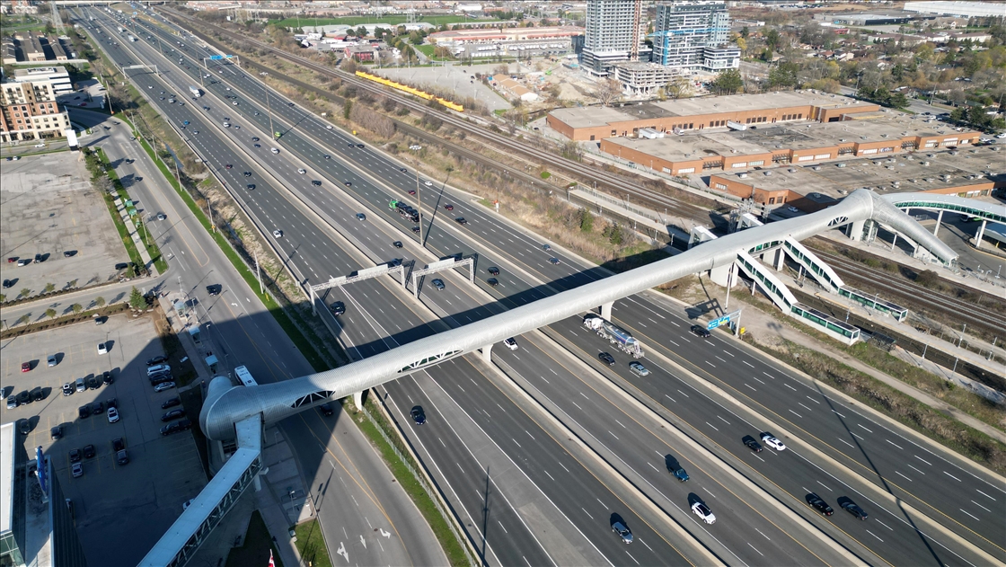 Kanada'nın Ontario eyaletinin Pickering şehrindeki Guinness Dünya Rekoru sahibi Pickering Yaya Köprüsü görüntülendi. İki şeritli yerel yolu ve 14 şeridi olan, 401 numaralı otoban üzerindeki 250 metrelik köprü altı aktif demiryolu hattına sahip.