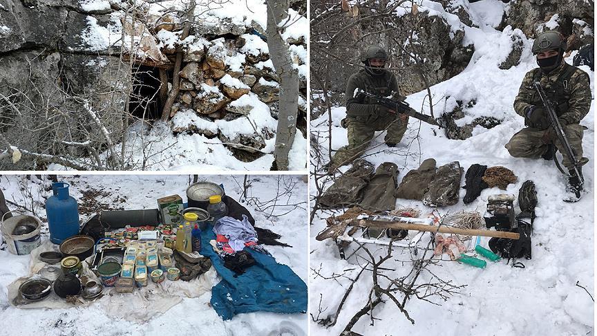 "Bölgede yapılan aramada teröristlere ait 2 kimlik kartı, RPG-7 roketatar, 4 RPG-7 mühimmatı ve sevk fişeği, el bombası, 106 muhtelif fişek, el dürbünü, radyo, el yapımı patlayıcı yapımında kullanılan devre kartı, 7 el yapımı patlayıcı düzeneği, 9 elektrikli fünye, 5 elektronik devre kartı, uzaktan kumanda, el yapımı patlayıcı yapımında kullanılan saat, 10 metre kablo, 7 pil bloku, terörist kıyafeti, 2 not defteri, şemsiye, 2 uyku tulumu ve yaşam malzemesi ele geçirildi."