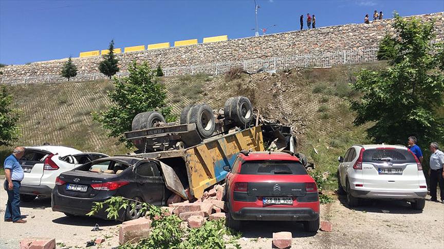Osman Şahinbaş (44) yönetimindeki 28 AB 761 plakalı parke taşı yüklü kamyonet, 10 metre yüksekliğindeki yoldan çıkarak Fırat Üniversitesi Hastanesi otoparkındaki araçların üzerine devrildi.