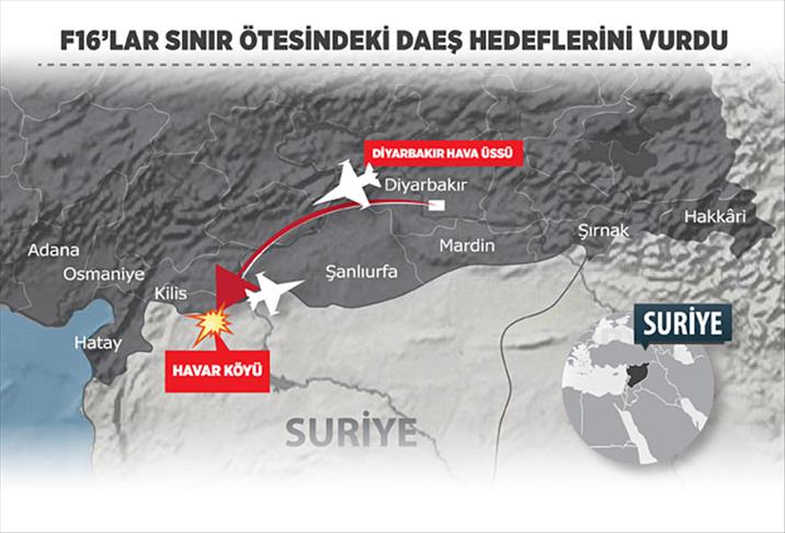 Saat 03.12’de Diyarbakır 8. Jet Ana Üs Komutanlığı’ndan 3 F-16 havalanmış, 03.40-03.53 arasında icra edilen hava harekatı ile DAEŞ terör örgütüne ait 3 hedef vurulmuştur. Daha önceden belirlenen 2 karargah ve 1 toplanma noktasına 4 güdümlü bomba atılmıştır. Uçaklarımız 04.24’te üslerine intikal etmişlerdir."