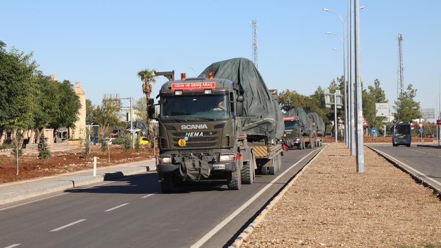 Türkiye'nin çeşitli kentlerindeki birliklerden gönderilen ve aralarında obüslerin de yüklü olduğu askeri araçlardan oluşan konvoy, Kilis'e geldi.