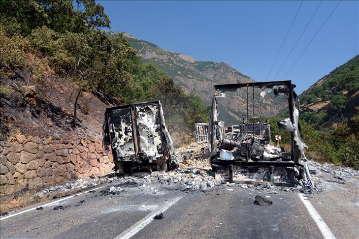 - Bölücü terör örgütü PKK mensubu silahlı bir grup, Tunceli-Erzincan karayolunun 40. kilometresi Zağge mevkisinde 4 tır ve bir iş makinesini benzin dökerek yaktı.