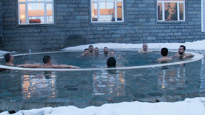 Bir otele ait 37 derece sıcaklıktaki suyla doldurulan havuza ilgi gösteren tatilciler, soğuk hava ve kar altında farklı bir deneyimin tadına varıyor.