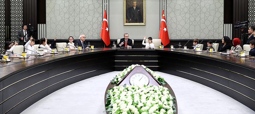 Cumhurbaşkanı Recep Tayyip Erdoğan, Cumhurbaşkanlığı Sarayı'nda 23 Nisan Ulusal Egemenlik ve Çocuk Bayramı dolayısıyla Milli Eğitim Bakanı Nabi Avcı ile Ankara'daki okullardan gelen öğrencileri kabul etti.