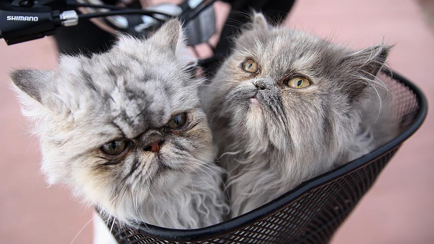 Antalya'da bisikletiyle her gün 15 kilometre kent turu yapan makine mühendisi Araz Keleş'in biri omzunda diğeri sepetindeki İran cinsi kediler Latte ve Duman, hem Antalyalıların hem de turistlerin yoğun ilgisini çekiyor.